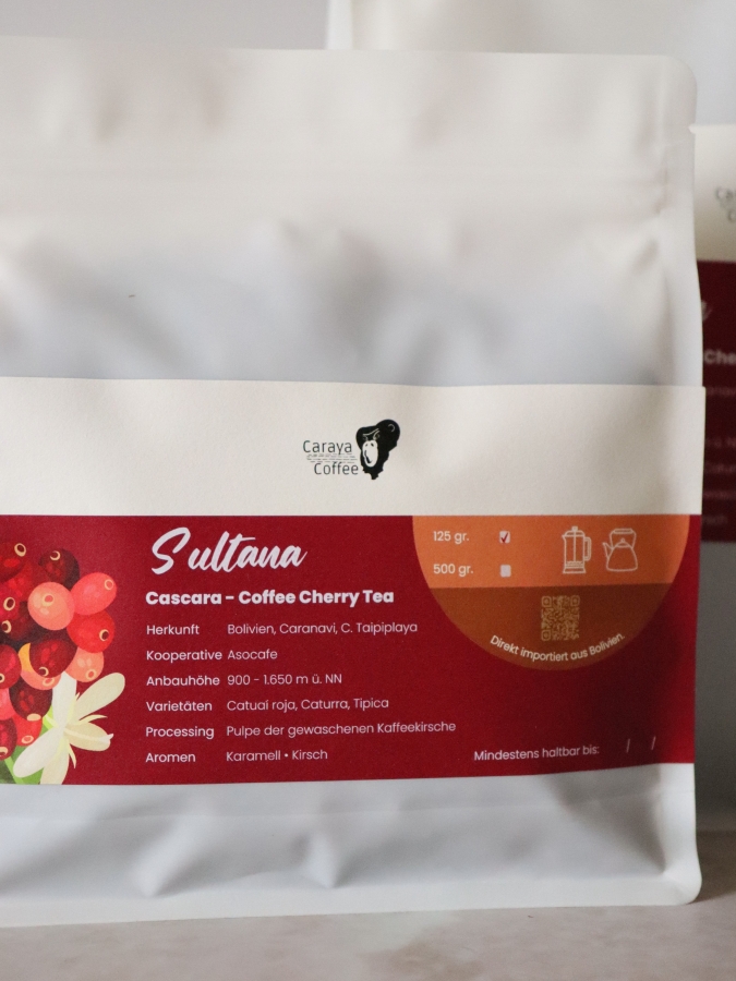 Die getrockneten Schalen der Kaffeekirschen werden in Bolivien gerne als Tee konsumiert. Der "Kaffeekirschentee" hat nur 20-25% vom Koffeingehalt der gerösteten Kaffeebohne, was ihn zu einem sanften Wachmacher macht. Beim Entpulpen der Kaffeekirschen - um an die Samen zu gelangen, die wir als Kaffeebohnen bezeichnen - fällt dieses Produkt nebenbei an. "Cascara" erfreut sich in Deutschland immer größerer Beliebtheit. Es ist eine gute Möglichkeit für unsere Kaffeeproduzierenden, einen kleinen Nebenerlös zu haben.